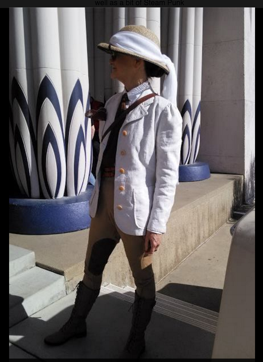 Robert did a fast little fitting with the mockup after the Egyptian Expedition event. After that I started working with the "real" fabric. This is fabric that I bought when I was up at Jen's house. There was a fabric store going out of business and Jen and I visited them twice! I bought this fabric (with no info on what it is made of) for $3 a yard. It is like a tweed, somewhat loose weave. It probably has polyester in it. . . and maybe some cotton? I did shrink it by misting and steaming it. It does wrinkle somewhat.